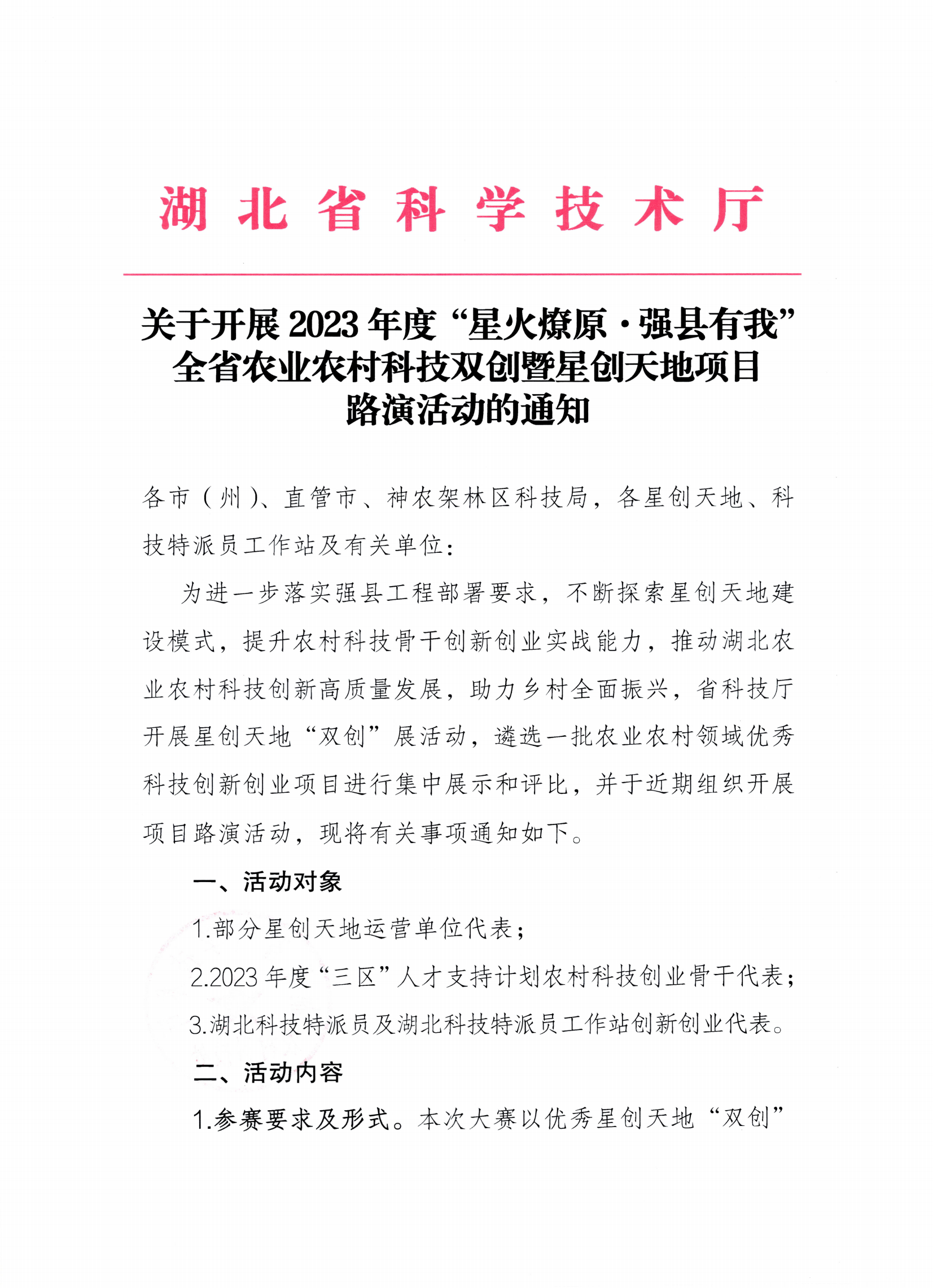 【通知公告】关于开展2023年度“星火燎原·强县有我”全省农业农村科技双创暨星创天地项目路演活动的通知