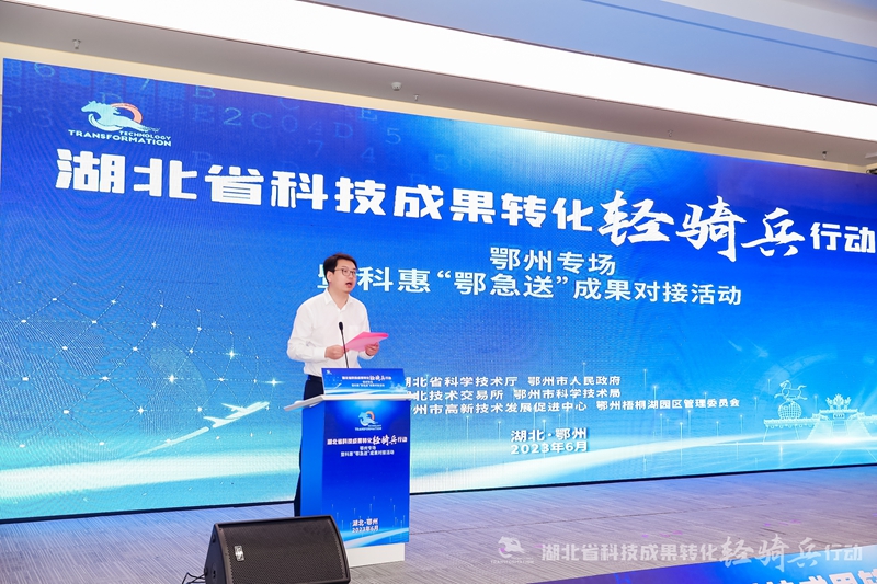 6月9日上午,湖北省科技成果转化“轻骑兵行动”鄂州专场暨科惠“鄂急送”成果对接活动在鄂州市梁子湖生态文明展示馆成功举办,省科技厅二级巡视员戴新明、鄂州市人民政府副秘书长曹晖、省科技厅成区处二级调研员秦兴龙、湖北技术交易所所长陈汉梅、鄂州市科学技术局党组书记、局长杨伟志出席活动。本次活动由湖北省科学技术厅、鄂州市人民政府主办,湖北技术交易所、鄂州市科学技术局、鄂州梧桐湖园区管理委员会承办。