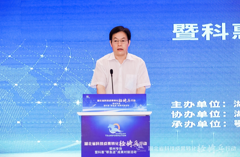省科学技术厅二级巡视员戴新明指出,面临当前科技创新和成果转化工作的新形势、新任务、新挑战,为贯彻落实省委、省政府关于打造政产学研金服用“北斗七星”式科技成果转化服务体系、促进科技经济深度融合、加快创新驱动高质量发展的部署要求,省科技厅启动实施“科技成果转化轻骑兵行动”,旨在动员和组织全省科技系统的力量,以科技成果转化服务为重点,为我省企业创新和产业发展提供机动灵活、精准送达的各类科技创新服务。本场活动的举办,希望引导带动更多创新要素集聚鄂州,促进更多科技成果在鄂州这片创新创业热土转化落地,更好地支撑鄂州市经济社会高质量发展。